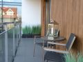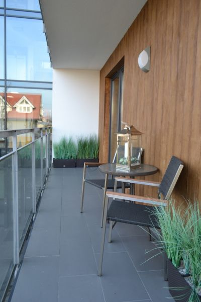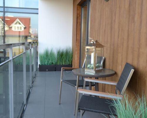 Przestronny balkon-taras wyposażony w fotele, stolik.