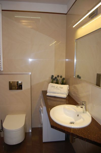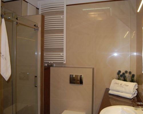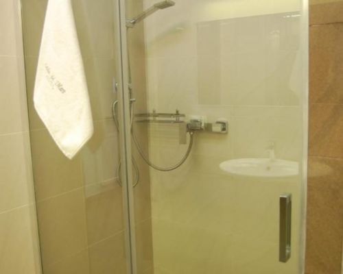 Kabina prysznicowa z deszczownicą, umywalką i dużym lustrem, wyposażona w: pralkę, deskę do prasowania, żelazko, suszarkę do prania, suszarkę do włosów, ręczniki, odkurzacz.